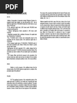Datu taguranao benito vs sec. Form Types Review reference versions of EDGAR forms filed by companies funds and individuals. On November 18 1976 petitioner Datu Tagoranao filed with respondent Securities and Exchange Commission a petition alleging that the additional issue worth P11098000 of previously subscribed shares of the corporation was made in violation of his pre-emptive right to said additional issue and that the increase in the authorized capital stock of the corporation from. Articles of Incorporation AIC of Jamiatul Philippine-Al Islamia Inc.